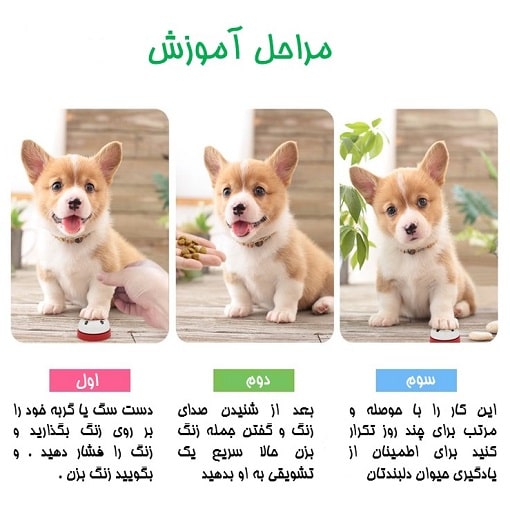 مثلاٌ برای بیرون رفتن بگویید بریم بیرون و دست سگ را بر روی زنگ بگذارید . یا برای غذا بگویید غذا میخوای و همراه با گفتن این جملات با دست حیوان دکمه را فشار دهید و …..