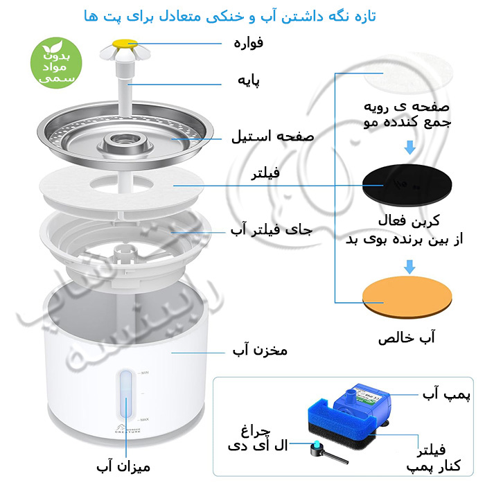 | لوازم جانبی | کابل یو اس بی، پمب آب، یک عدد فیلتر |