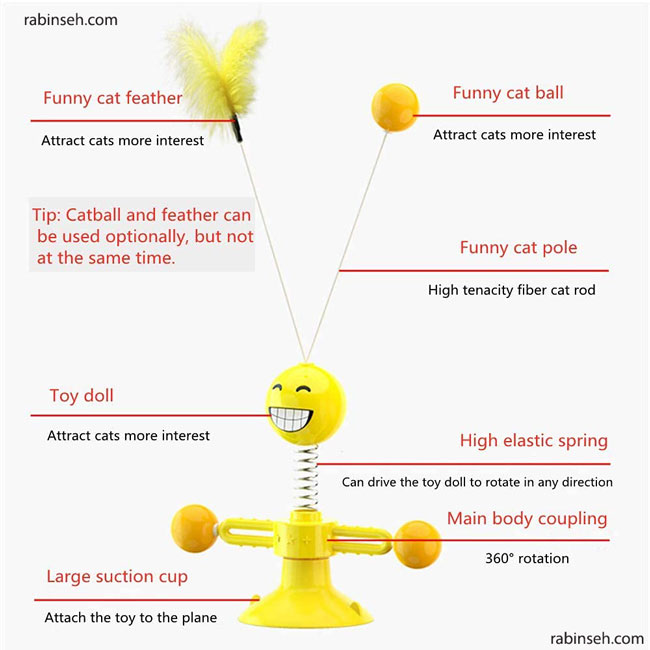 این اسباب بازی منحصر به فرد و چند منظوره است وقتی گربه با نیروی ملایم بازی می کند، توپ اسباب بازی یا پر اسباب بازی در بالای سر عروسک می تواند آزادانه تاب میخورد. دو طرف اسباب بازی با توپ های چرخان طراحی شده است و گربه فقط باید آن را به آرامی لمس کند و توپ ها می چرخند. این نه تنها یک اسباب‌بازی است، بلکه می‌تواند یک ابزار آموزشی نیز باشدو هوش گربه را بهبود بخشد و احساس تنهایی گربه را از بین ببرد