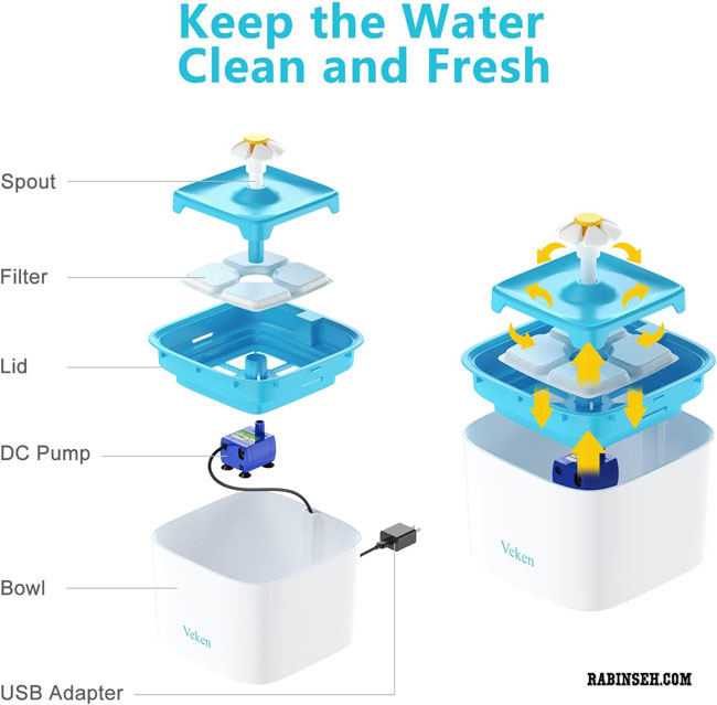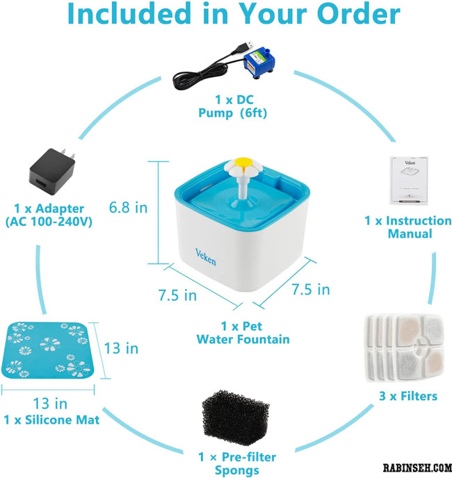 | لوازم جانبی | آداپتور،پمب آب،دو عدد فیلتر و یک مت سیلیکونی زیر ظرف |